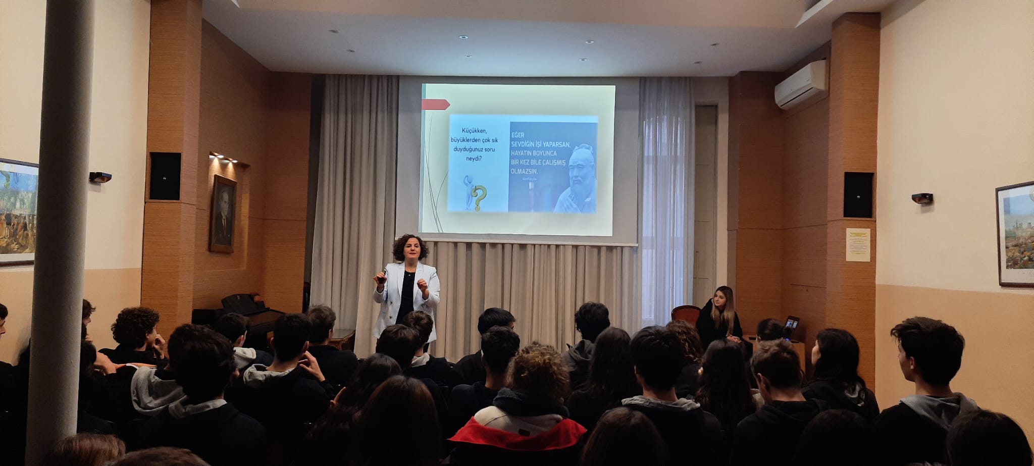 Sunumda hayal etmenin önemi paylaşıldı. Meslek nedir? Meslek seçimini etkileyen faktörler nelerdir? sorularının yanıtları öğrencilerle birlikte cevaplandı. Meslek seçiminde iilgi ,yetenek ve mesleğin değerinin önemi üzerinde duruldu. "Meslek seçimi nasıl olur?" sorusunun cevabı arandı. Ders seçimi yaparken dikkat edilmesi gereken noktalar ve alanlarına göre mesleklerin neler olduğu paylaşıldı.
