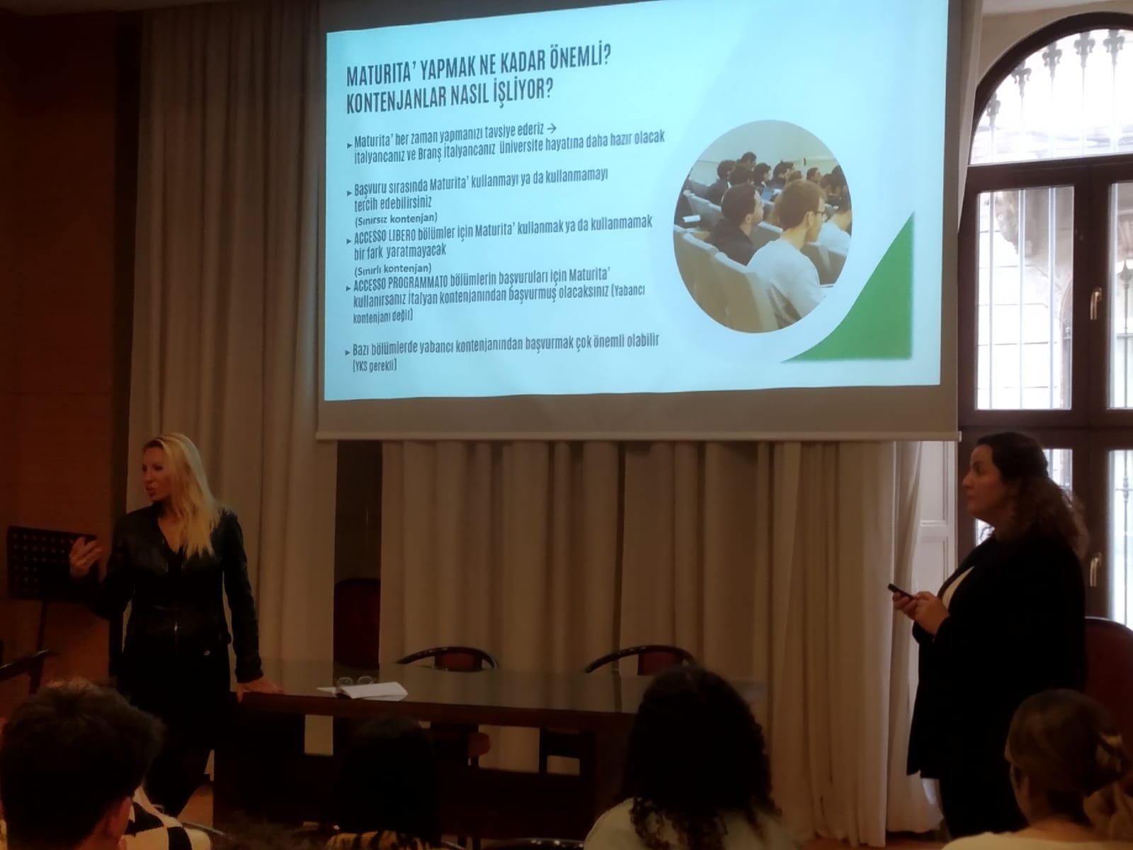 Türk Müdür Başyardımcısı Deniz Hadimoğlu ve Psikolojik Danışman Özlem Saraç, İtalya’daki üniversitelere giriş koşulları hakkında 11.sınıf öğrencilerine yönelik bir sunum yaptı. Sunumda; öğrencilerin İtalya’da en çok tercih ettiği bölümler, yapılacak başvuruların ne zaman ne nasıl olacağı, üniversitelere Maturita ve yabancı kontenjanı ile başvurmanın önemi ve üniversitelerden kabul alma koşulları hakkında bilgi verildi.
