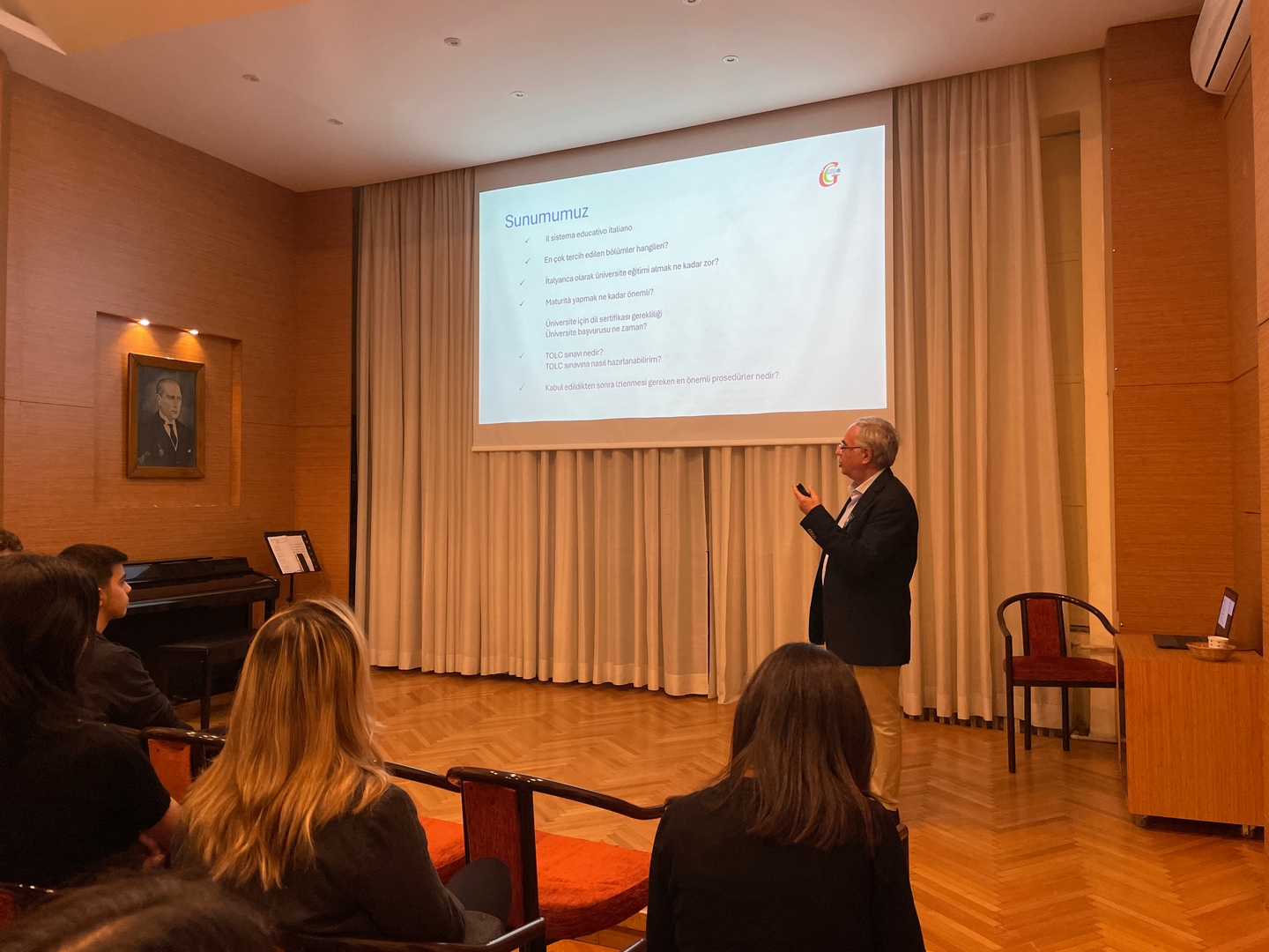 Yurt Dışı Danışmanlarımız Petro Rodrıguez ve İrene Pilloni ise gerçekleştirdikleri İtalyan sistemi sunumunda CİLS, TOLC sınavları, Maturita mezunu olmanın avantajları, İtalya'daki üniversiteler, burslar ve vize süreçleri hakkında bilgi verdi. Sunum, öğrencilerimizden gelen sorulara cevap verilerek bitirildi.