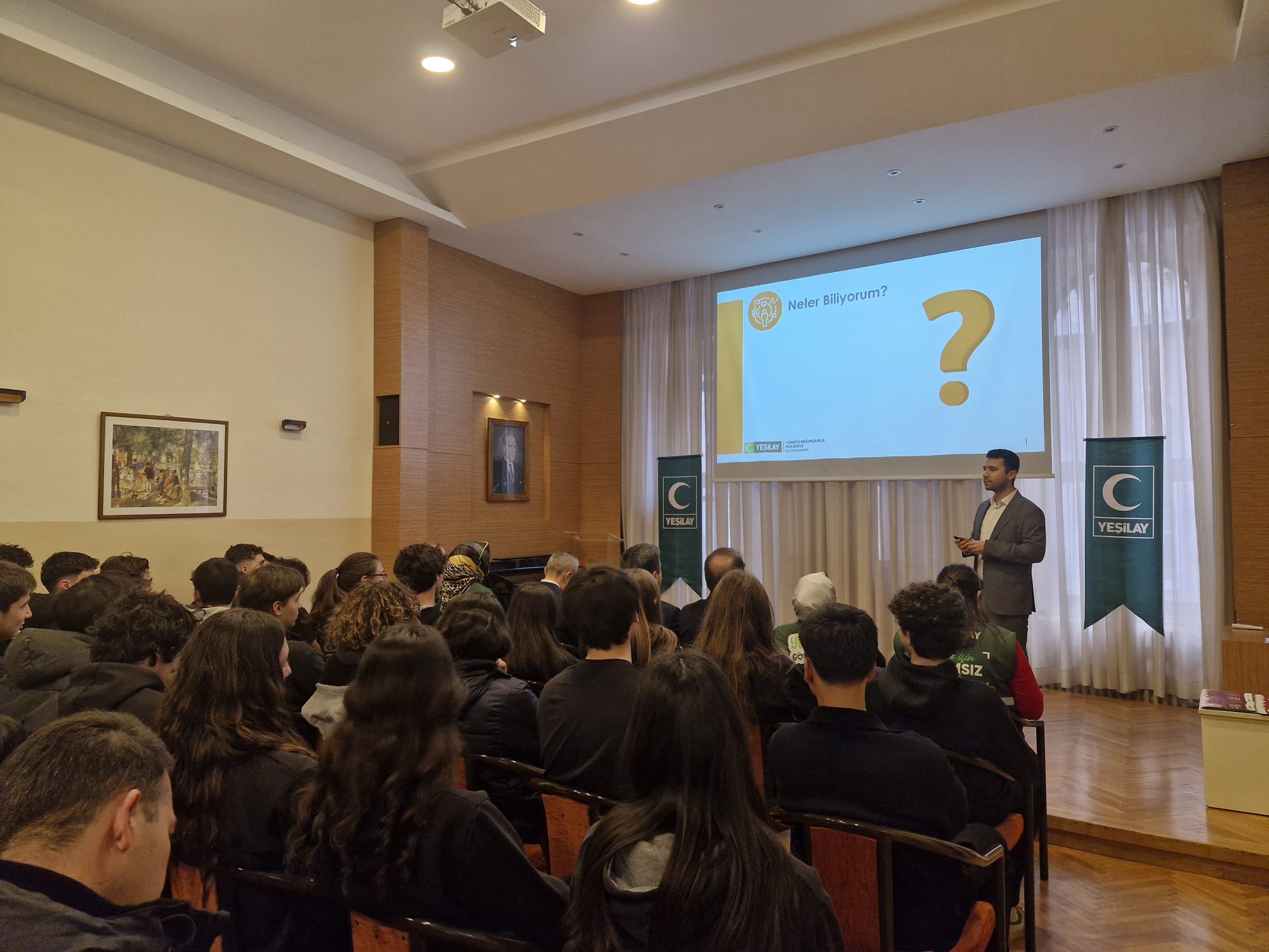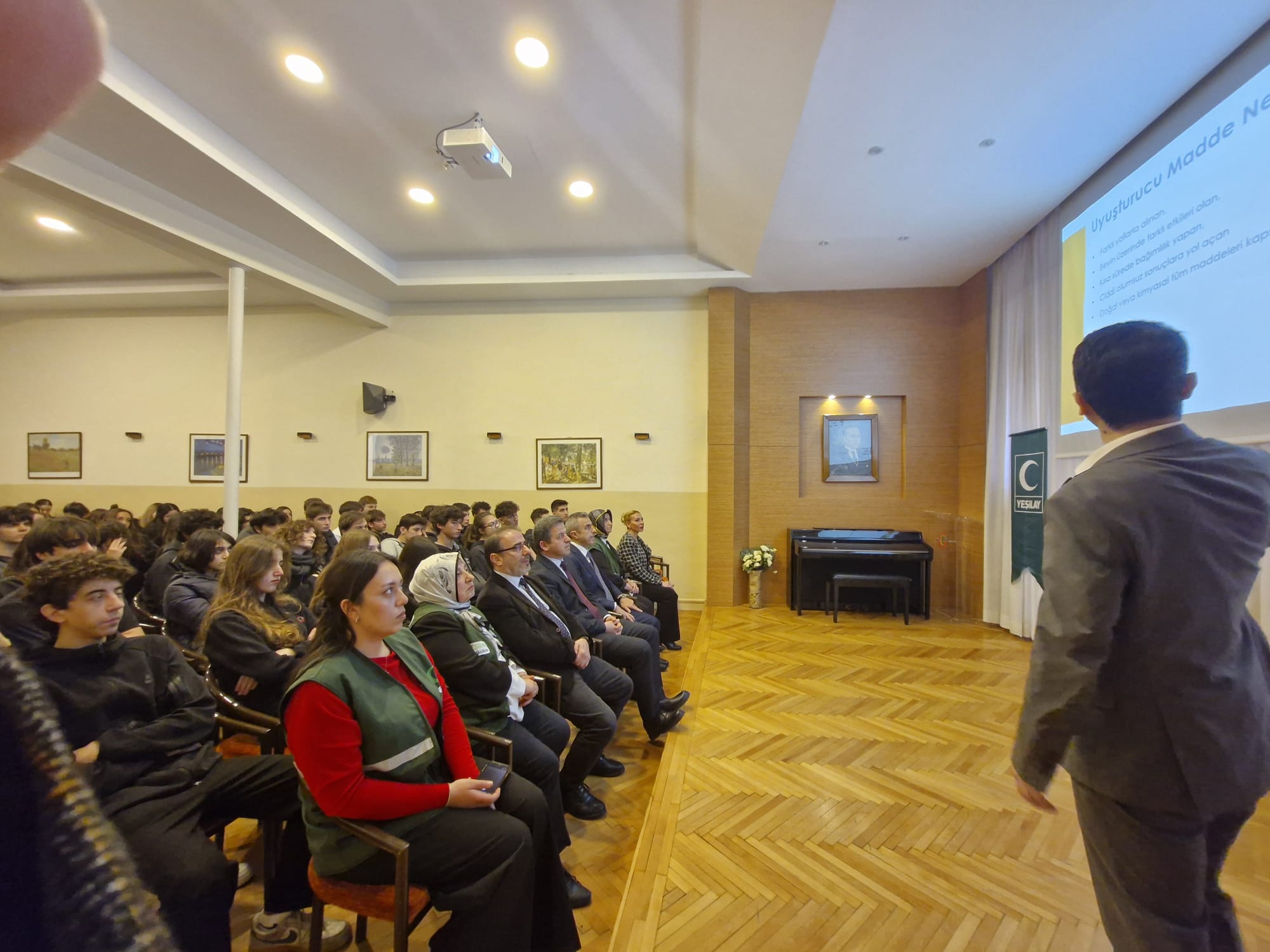 Okulumuz Afad Kulübü ve Yeşilay Beyoğlu Şubesinin organize ettiği eğitim seminerine öğretmen ve öğrencilerimizin yoğun ilgisi vardı. Yeşilay sunumunu yapan Uzman Öğretmenimiz; Türkiye' de otuz yaş üzeri madde kullanımında Avrupa birincisi olduğumuzu söyleyerek bu konuda çok dikkatli olunması gerektiğini belirtti.