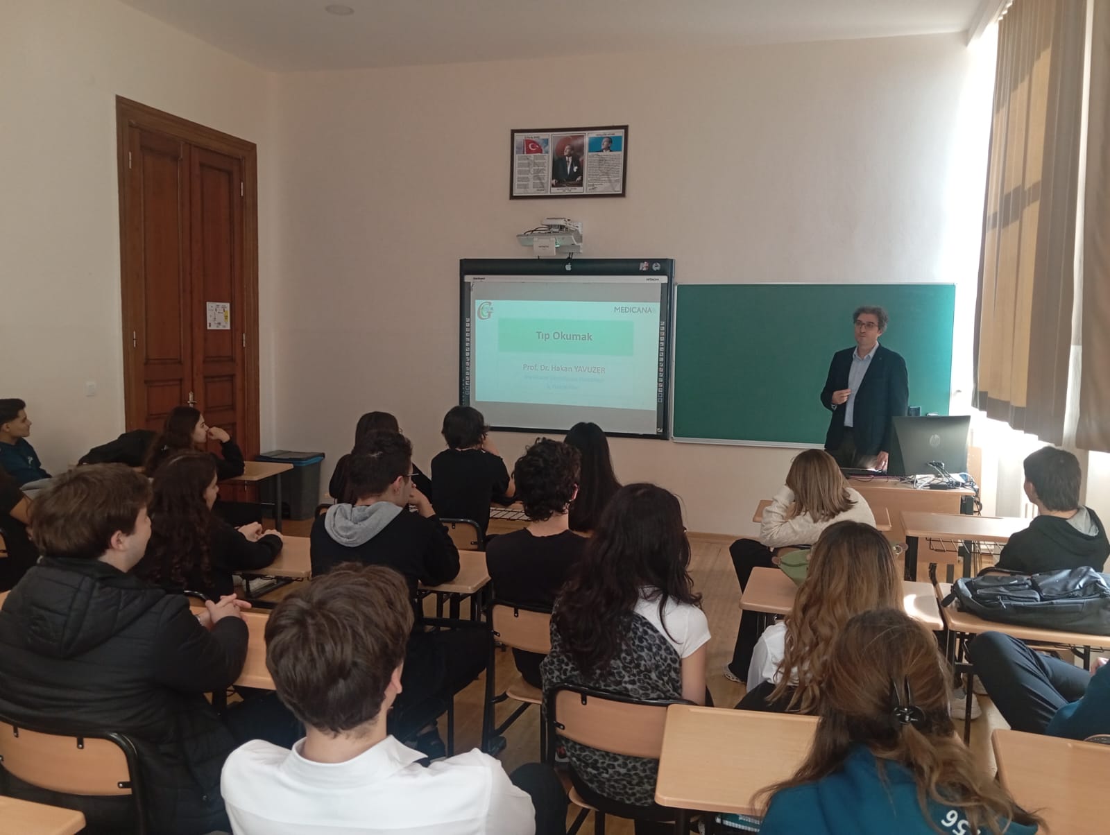 Kariyer günleri etkinliğimizin bir diğer konuğu Prof. Dr. Hakan Yavuzer'in Tıp üzerine verdiği konferans öğrencilerimiz tarafından ilgi ve merakla takip edildi. Tıp eğitiminin Türkiye' de ve dünyada bulunduğu nokta, içerdiği zorluklar ve avantajlarıyla birlikte tüm hatlarıyla ortaya kondu. Öğrencilerimizin tıp eğitimi almak için neler yapması gerektiği hususunda aldıkları bu son derece önemli konferans için saygıdeğer konuğumuz Prof. Dr. Hakan Yavuzer' e teşekkürü bir borç biliriz.